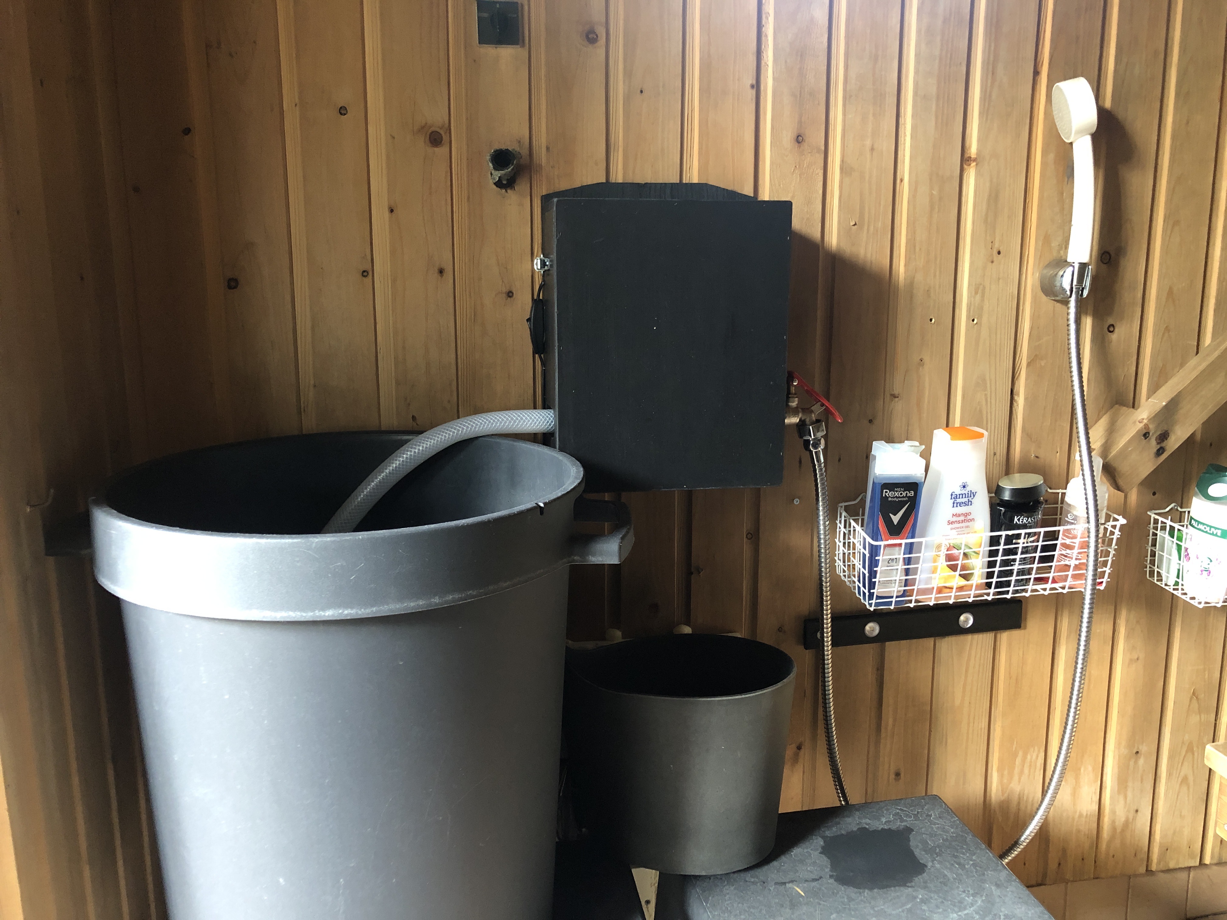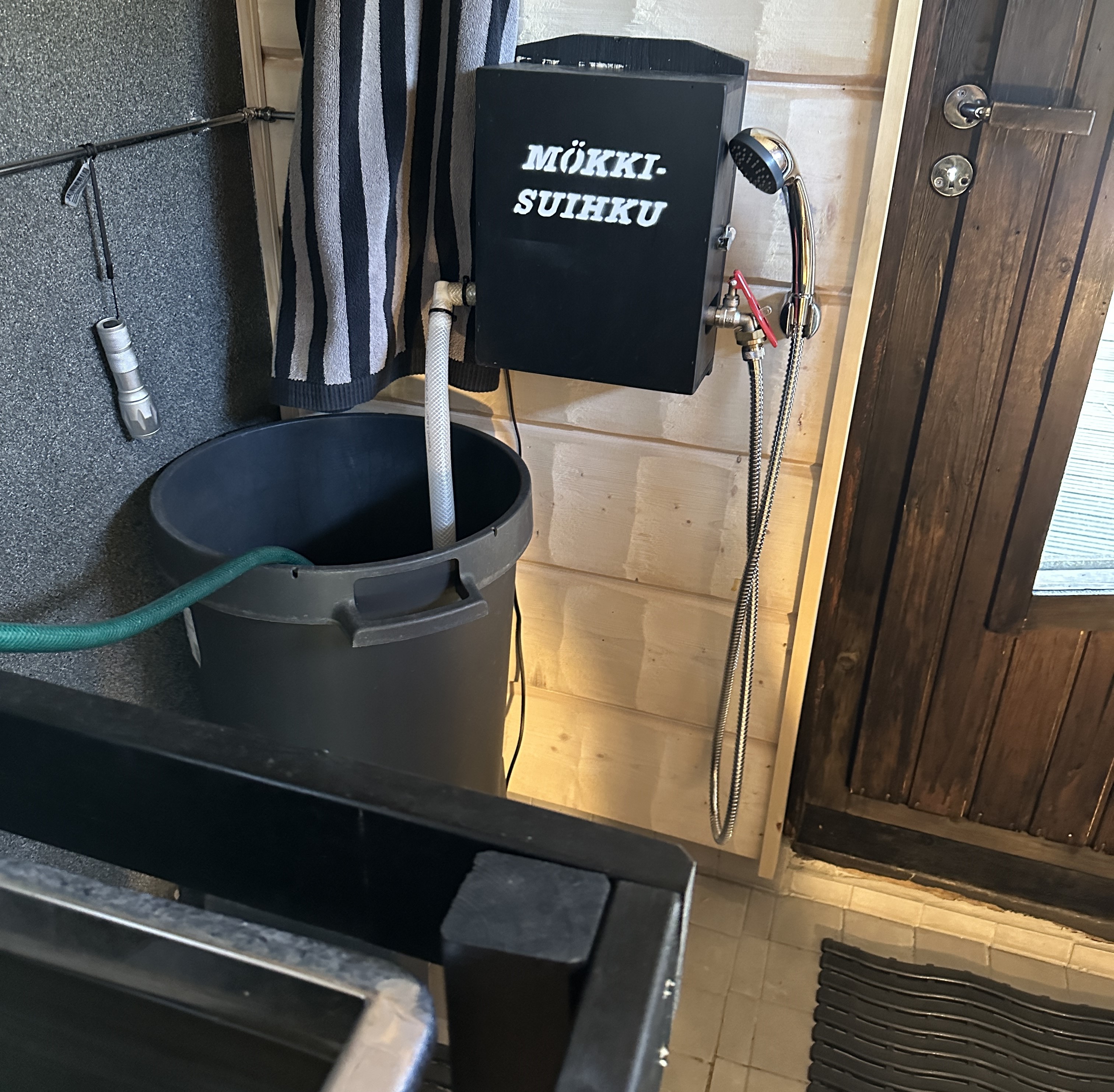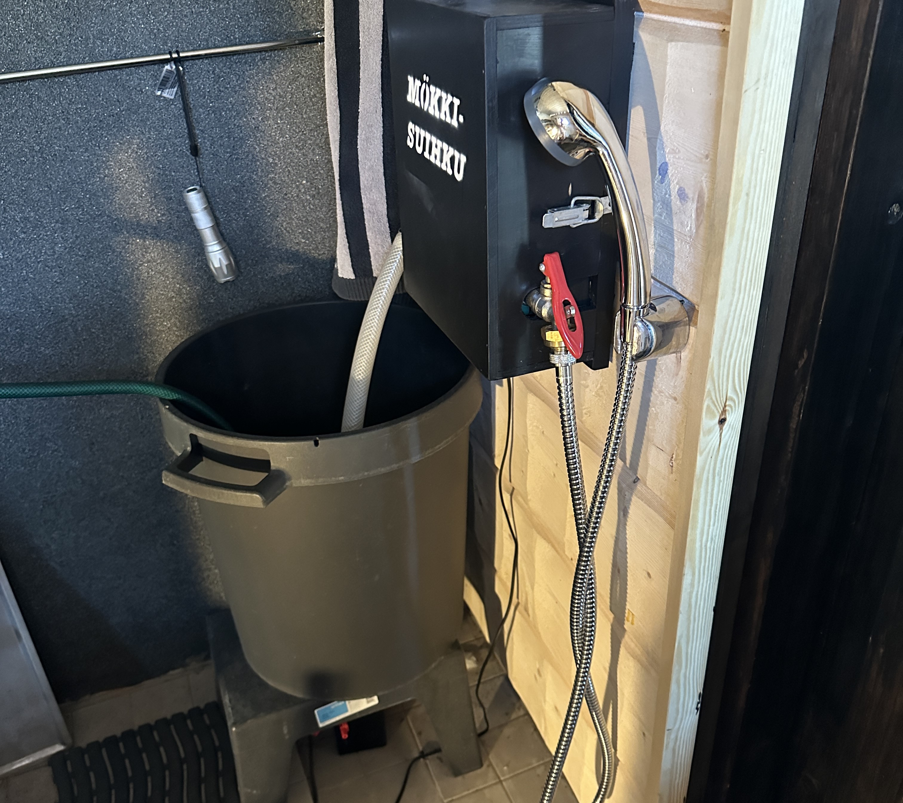 Mökkisaunaan valmis, toimiva suihkupaketti.